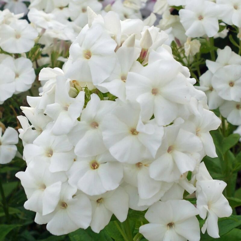 Белый, цветок колесовидный, соцветие овально-коническое, плотное. Темно-зеленая здоровая листва. Высота растения 50 см; диаметр цветка 4см. Цветет обильно и продолжительно, с июля до конца сентября.