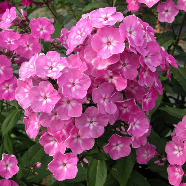 Округлые темно-розовые цветки словно покрывает полупрозрачный серебристый налет (особенно заметный в пасмурную прохладную погоду). В центре белоснежная «звездочка» на половину лепестка с широкой розовой каймой. Как будто до цветка дотронулись и стерли дымчатый налет. Соцветие коническое, крупное и плотное, с выступами.