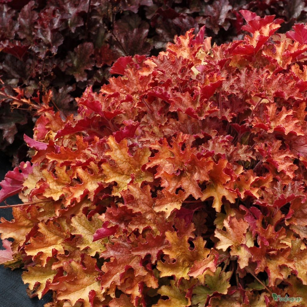 Сорт "осеннего настроения". Имеет резные, гофрированные листья с преобладанием оранжево-красных тонов. На протяжении всего периода роста происходит переход тонов: персиковый, коралловый. рыжий, медный. Высота около 25 см, диаметр 50-60 см., высота цветоносов до 50 см. Цветки маленькие, белые. Высота около 25 см, диаметр 50-60 см., высота цветоносов до 50 см. Цветёт июнь-июль. Зона зимостойкости: 4 (-35 ° С). Для посадки гейхеры наилучшим образом подойдут полутенистые места. Если участок освещается солнцем только в утренние часы - он оптимален для гейхеры. Почва должна быть рыхлой и хорошо дренированной, без застоя воды. Оптимальный рН=5-6.