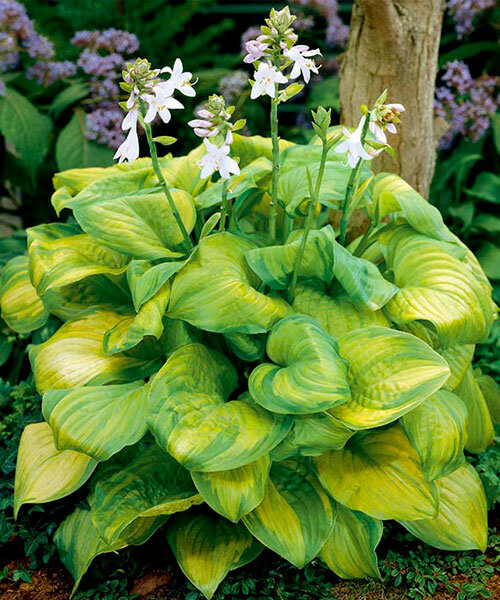 Хоста Guacamole - Блестящие яблочно-зеленые, с четко выраженными жилками, листья. К концу лета золотистые с темно-зеленой каймой. Окраска более интенсивно проявляется при выращивании на солнце или в легкой полутени. Кончики листьев изящно изгибаются. К концу лета они становятся золотистыми с темно-зеленой каймой. Цветы крупные, душистые, бледно-лавандовые. Куст взрослого растения достигает 60 см.