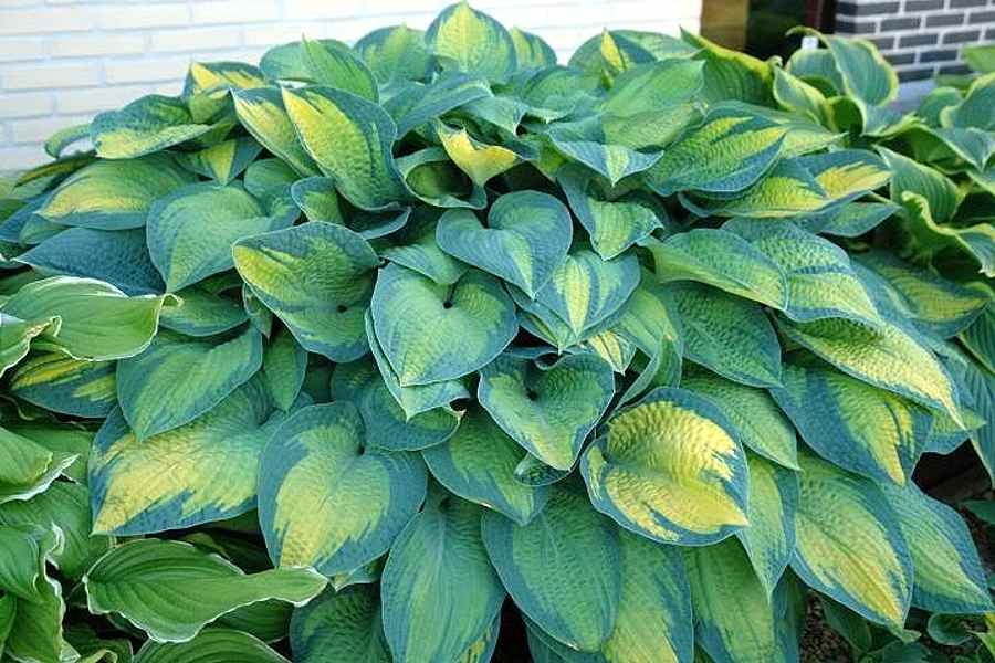 Многолетнее цветущее растение размером 45х95 см. Листья крупные (23 х 17 см), с маленькой заострённой верхушкой, чашевидные, широкоовальные, толстые, морщинистые, с хорошо выраженными жилками. Окраска листьев двухцветная: центр насыщенно голубовато-зелёный, края неравномерно широкие, зеленовато-жёлтые. Цветки белые, часто с лиловым оттенком, воронковидные, на высоких (до 80 см) цветоносах. Цветение наступает в июле.