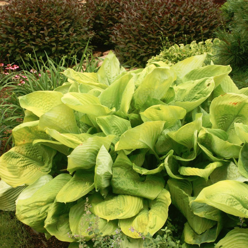 Sum and Substance - одна из самых крупных хост желтого цвета из имеющихся в настоящее время. Классический сорт во всех отношениях. Листья у сорта Sum and Substance умеренно гофрированные, с отличной текстурой, с глубокими лопастями, форма листа выгнута чашечкой, причем может быть выгнута и вверх и вниз. На конце листа имеется длинный кончик. Листья очень плотные, из-за чего плохо повреждаются улитками и слизнями. Хоста Sum and Substance имеет огромные габариты и во взрослом состоянии требует много места, Хосту Sum and Substance следует выращивать таким образом, что бы куст получал достаточно много солнца и влаги, также растению требуется достаточное количество питания и энергии что бы достигнуть своих колоссальных размеров. Размер XL