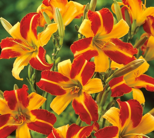 Эффектный травянистый многолетник. Листья узкие, вытянутые, образуют компактную прикорневую розетку. Цветение длительное за счет, большого количества цветов на цветоносе. Цветок шестираздельный, собран в соцветия. Спящий, диплойд, тип цветения дневной, высота до 60 см. Цветки до 12 см в диаметре, окраска двухцветная: внутренние лепестки кирпично-красные, внешние оранжево- желтые, цветет в июле – августе. Листва декоративна. Светолюбив. Почвы предпочитает рыхлые, плодородные, умеренно влажные. Хорошо смотрится в цветочных группах, миксбордерах, в оформлении водоемов.