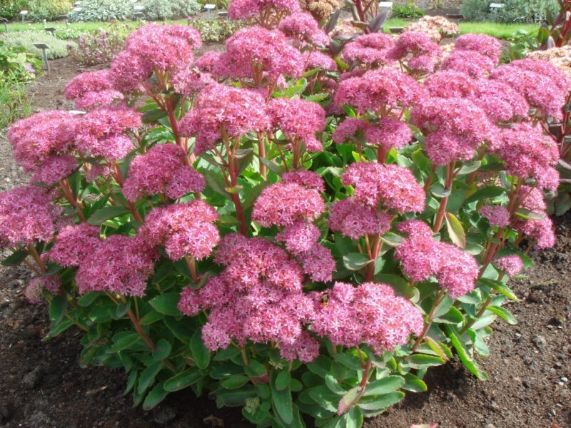 Это травянистое суккулентное низкорослое растение семейства Толстянковые. Высотой 30-35 см. Голубовато-зеленые толстые овальные листья с зубчатыми краями, стебли прямостоячие, красноватые. Мелкие ярко-розовые цветки собраны в плотные щитковидные соцветия диаметром от 7 до 15 см. Цветение в августе-октябре.