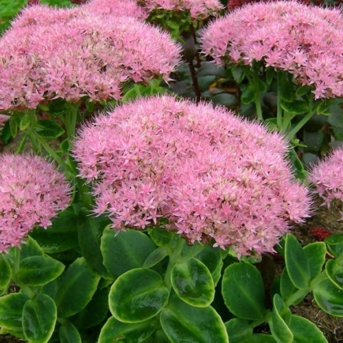 Листья крупные, голубовато-зеленые, мясистые. Высота во время цветения 50-60 см. Цветет в августе-сентябре. Цветки мелкие, лилово-розовые, собраны в соцветия-полузонтики.