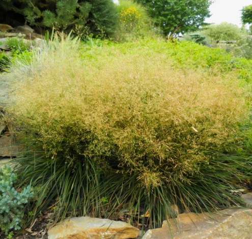 Декоративный злак. Образует очень плотные компактные кочки высотой и диаметром 30-40 см с большим количеством тонких, тёмно-зелёных листьев, которые остаются зелёными до -18ºС. Цветоносы жёлтые, высотой 40-50 см. Метёлки изящные. Цветки сначала пурпурно-зелёные, затем золотистые, стерильные, не образуют семян. Цветение обильное, в июле-октябре. Рекомендуется для посадки вместе с невысокими изящными многолетниками. Место солнечное или полутенистое. Почва влажная, дренированная. Зона 4 (до -29ºС).