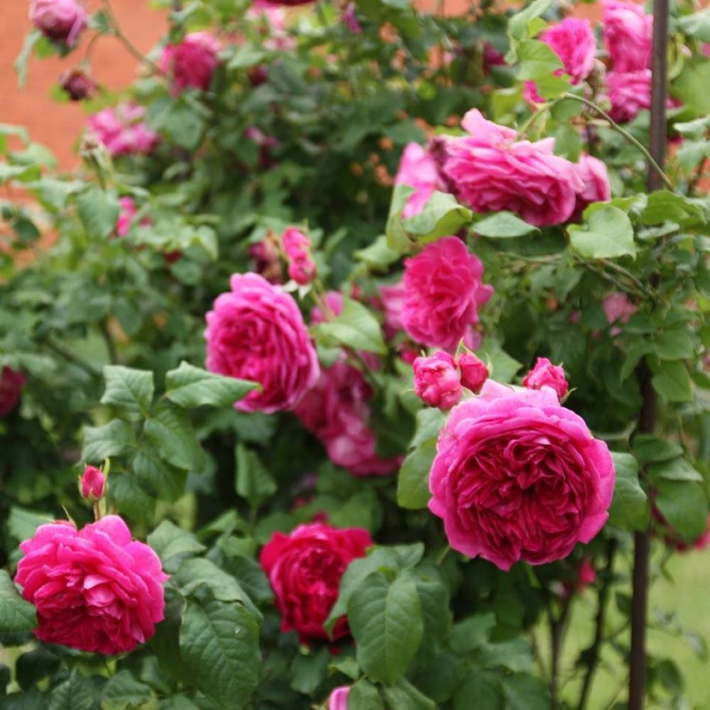 Цветки довольно крупные, глубоко чашевидные, даже в полном роспуске, с множеством мелких лепестков, уложенных с очаровательной небрежностью. Окраска : смесь густо-мажентового, розового и красного, внешние лепестки выгорают до светло-пурпурного, и все это контрастирует с серебристой изнанкой лепестков. Аромат восхитительный, заметно меняется со временем: вначале напоминает чайные розы, затем меняется до смешанного запаха чайных роз и розового масла, с древесными кедровыми нотками. Великолепно сочетается с розами и многолетниками другой окраски. Цветение волнами на протяжении всего сезона.