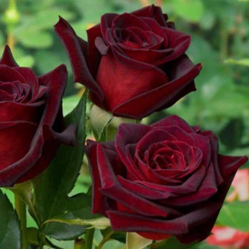 Это чайно-гибридная роза с темно-красными, бархатистыми цветками, которые в нераскрытом виде выглядят почти черными. Это сильнорослый, прямостоячий куст высотой до 1.5 м с темно-зеленой глянцевой листвой. Цветки среднего размера (8-9 см) имеют классическую бокаловидную форму, которая при полном раскрытии становится более открытой. Роза хорошо подходит для срезки и клумб, отличается длительным повторным цветением и имеет слабый, сладковатый аромат.