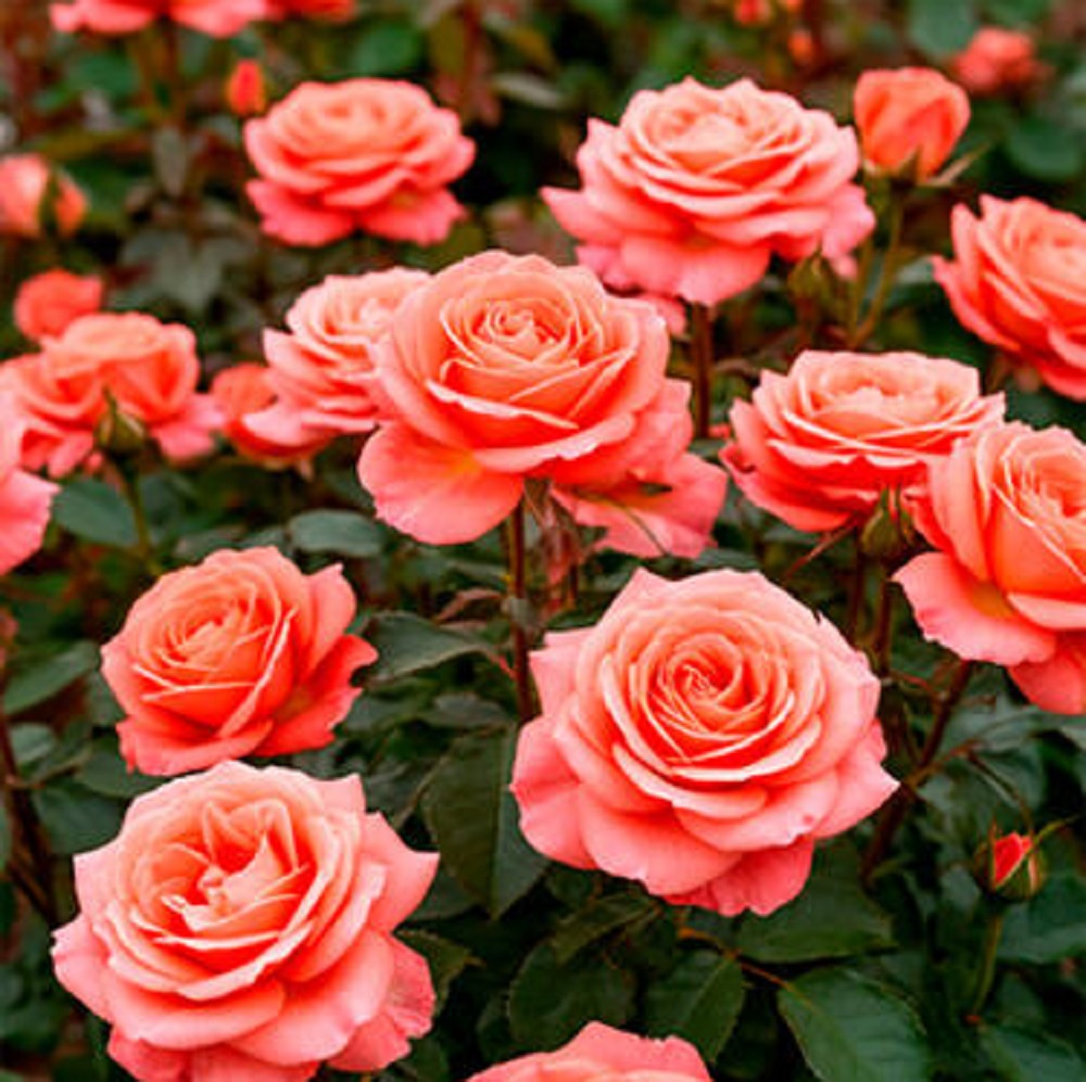 Чайно-гибридный сорт с крупными (до 10 см) двухцветными махровыми цветками лососево-желтого оттенка с розовым напылением по краям. Это сильнорослый куст высотой до 100 см с тонким ароматом, отличающийся обильным цветением с июня по сентябрь и средней устойчивостью к болезням.