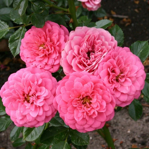 Уникальный сорт, второй такой розы нет. Это объясняет, почему специалисты не могут принять решение, классифицировать ли ее как флорибунда, миниатюрную розу или шраб. В жарком климате сорт может достигать 1 м в высоту, но в Германии, где сорт был выведен, высота не превышает 50 см. Цветки восхитительные: множество мелких лепестков аккуратно уложены рядами по кругу, как у хризантемы. Цветки темно-розовые или вишневые, когда только распустятся, затем немного выгорают. Они появляются в кистях по 5-20 шт. Кустик очень аккуратный, низенький, с мелкой темно-зеленой блестящей листвой. Превосходная роза для контейнеров или для переднего края бордера, очень обильноцветущая.