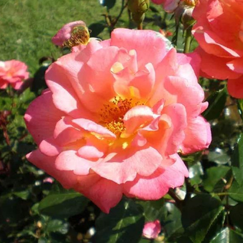 Яркая, неприхотливая флорибунда с оранжево-желтыми, затем кораллово-красными, не выгорающими цветками, собранными в крупные зонтиковидные соцветия, цветет обильно все лето, обладает сильным здоровьем листвы и высокой устойчивостью к болезням и морозам, идеальна для клумб, бордюров, штамбов и срезки.