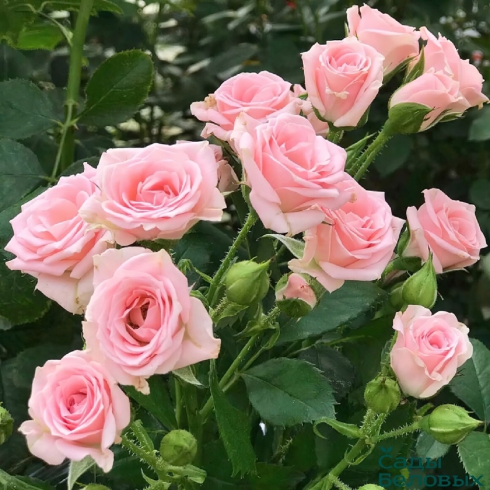 Компактные розовые кусты отличаются невысоким ростом, до 60 см, и средней степенью разрастания в ширину, до 50 см. Пышные растения цветут обильно и долго, образуя соцветия по 5-10 бутонов, каждый диаметром по 3-6 см в раскрытом виде. Цветы издают нежный и тонкий аромат, хотя и несильный. Встречаются разные варианты окраски бутонов – от розовато-кремового до темно-малинового. Гибрид устойчив к распространенным заболеваниям розовых кустов и зимним морозам. Применяется для украшения переднего плана бордюров, одиночных посадок в саду и коммерческой срезки цветов.