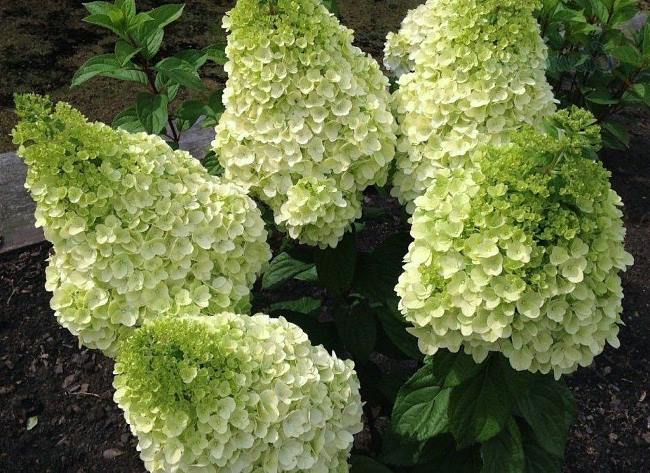 "Мэджикал Килиманджаро" (Hydrangea ’Magical Kilimanjaro’): Данный сорт представляет собой компактный куст с сильными вертикальными ветвями, вырастающий до 1,2 — 1,5 м в высоту и аналогичной ширины. Зеленоватые цветки диаметром 2,5 — 3 см постепенно приобретают ярко-белую окраску. В середине лета крону растения украшают густые красивые крупные конические соцветия длиной 20-25 см. Цветет этот кустарник с июля по сентябрь. Этот сорт подходит для солнечного или частично затененного места. Хорошо растет на плодородных суглинистых, влажных, хорошо дренирующих почвах. Морозостойкий (до -28 °C).