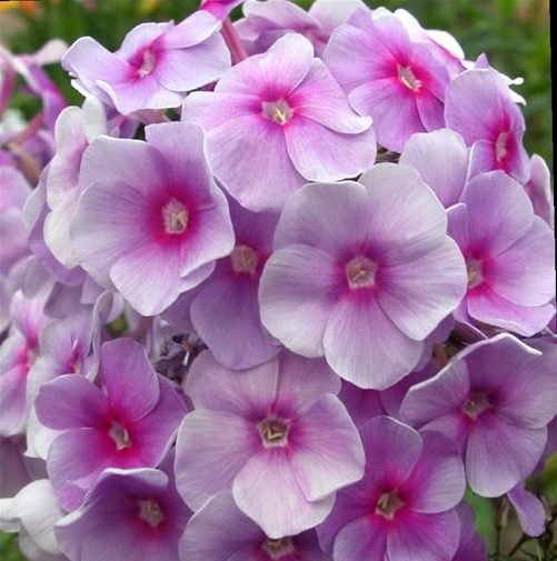 Светло-сиреневый с фиолетовыми тенями и пурпурным колечком. Цветок диаметром 3,6 см, колесовидный. Соцветие округло-коническое, средней плотности. Куст высотой 70 см.