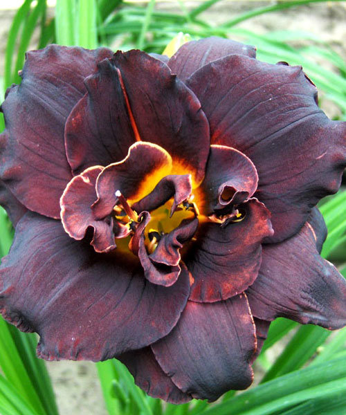 Лилейник Вуду Дансер - один из самых тёмных лилейников, которые вы когда-либо могли видеть! И этим не ограничивается уникальность сорта. Цветы лилейника необычайно насыщенной окраски: это первый чёрный, да ещё и махровый, сорт! Цветы пышные, с лёгкими, но плотными лепестками, которые так необычно развеваются при порывах летнего ветра. На солнце у лепестков появляется рубиновый оттенок, который дарит цветению праздничную нотку. При этом диаметр цветов 14 см, то есть пышному цветущему букету, состоящему из таинственных цветов, обзавидуются все соседи по даче. Лилейник Вуду Дансер одинаково прекрасно смотрится как с жёлтыми, так и с красными и розовыми сортами цветов. Так как высота Вуду Дансера 55 см, то желательно выбирать коллег по клумбе также яркого оттенка, чтобы визуальна клумба не казалась плоской. Мы рекомендуем ярчайший красный сорт Ночной Янтарь или Беррилишес, Насыщенный розовый и уже всеми любимый Файнал Тач, а также Даэ ту Лав. Цветение, как и обычно, начинается у Вуду Дансера в июне. Вы его точно не пропустите, так как цветы молниеносно привлекают внимание и источают прекрасный лёгкий аромат.