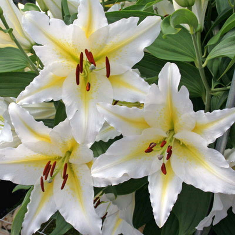 Белоснежная красавица с золотой звездой в центре прекрасно смотрится в букете. А цветение этой лилии в саду невозможно сохранить в тайне: сладкий аромат, растекающийся по саду призывает всех найти его прекрасный источник и полюбоваться. Диаметр цветка 15 см. Высота растения до 120 см.