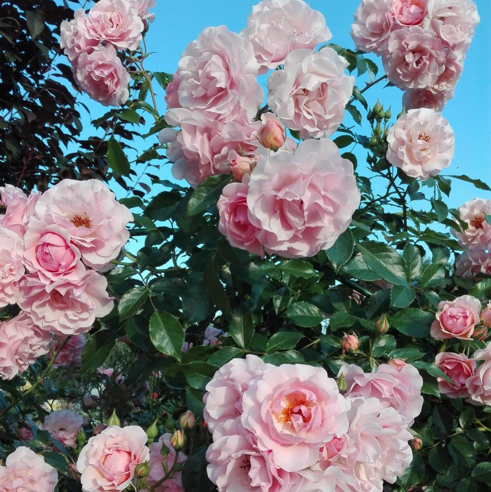 Роза Розарио кустарниковая, Тантау — чисто-розовые цветки из 17-25 лепестков, чашевидной формы, собраны в большие соцветия, в полном роспуске показывают серединку. Ветви дугообразные, ниспадающие с крупной, глянцевой листвой. Цветет обильно, двумя волнами. На дождь практически не реагирует. Очень здоровый и устойчивый сорт.